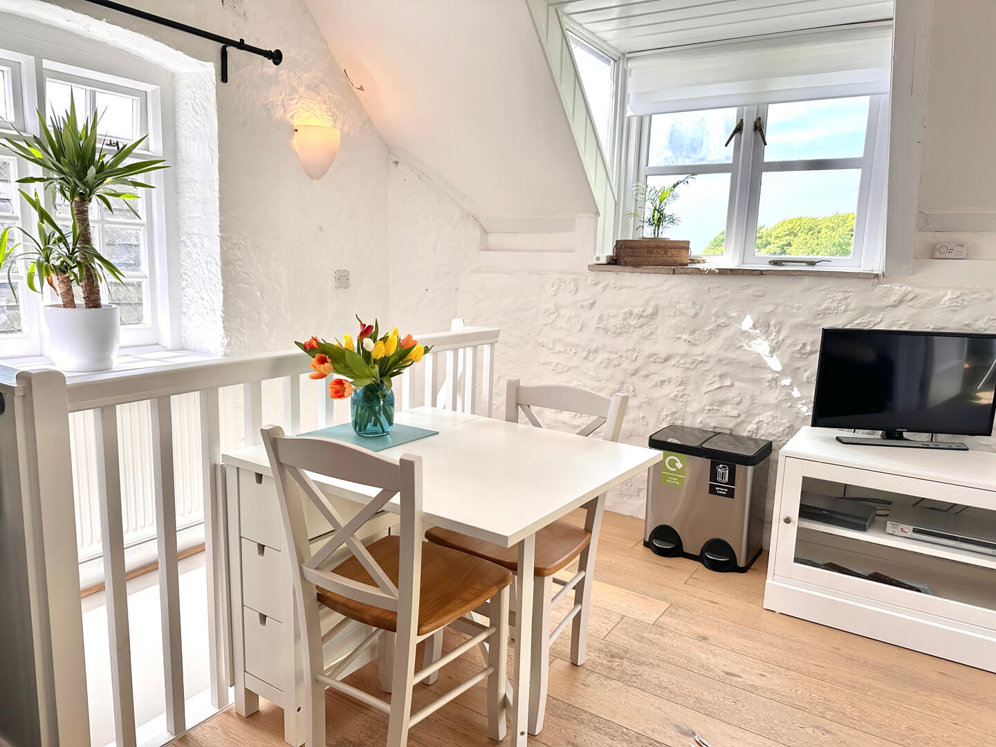 Throughout the Hideaway, a variety of decorative floor lamps, feature lighting and the logburner compliment the light nature of the cottage, helping to create the perfect mood throughout the year. Four windows facing three orientations include a glass sided dormer looking south west along the coast and the split stable door with views up towards gardens and leafy slopes beyond.